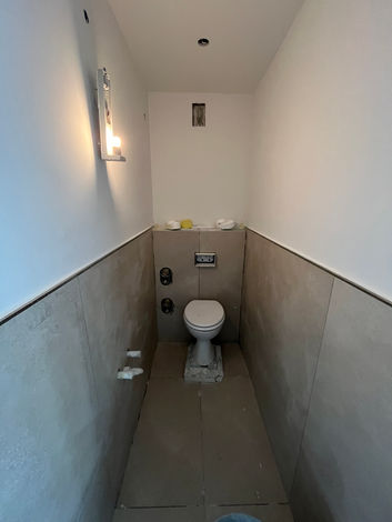 Das Bad sollte hell und groß verfließt werden. Hier wurden es 80x80 Villeroy&Boch Fliesen in Sandstein Beige.